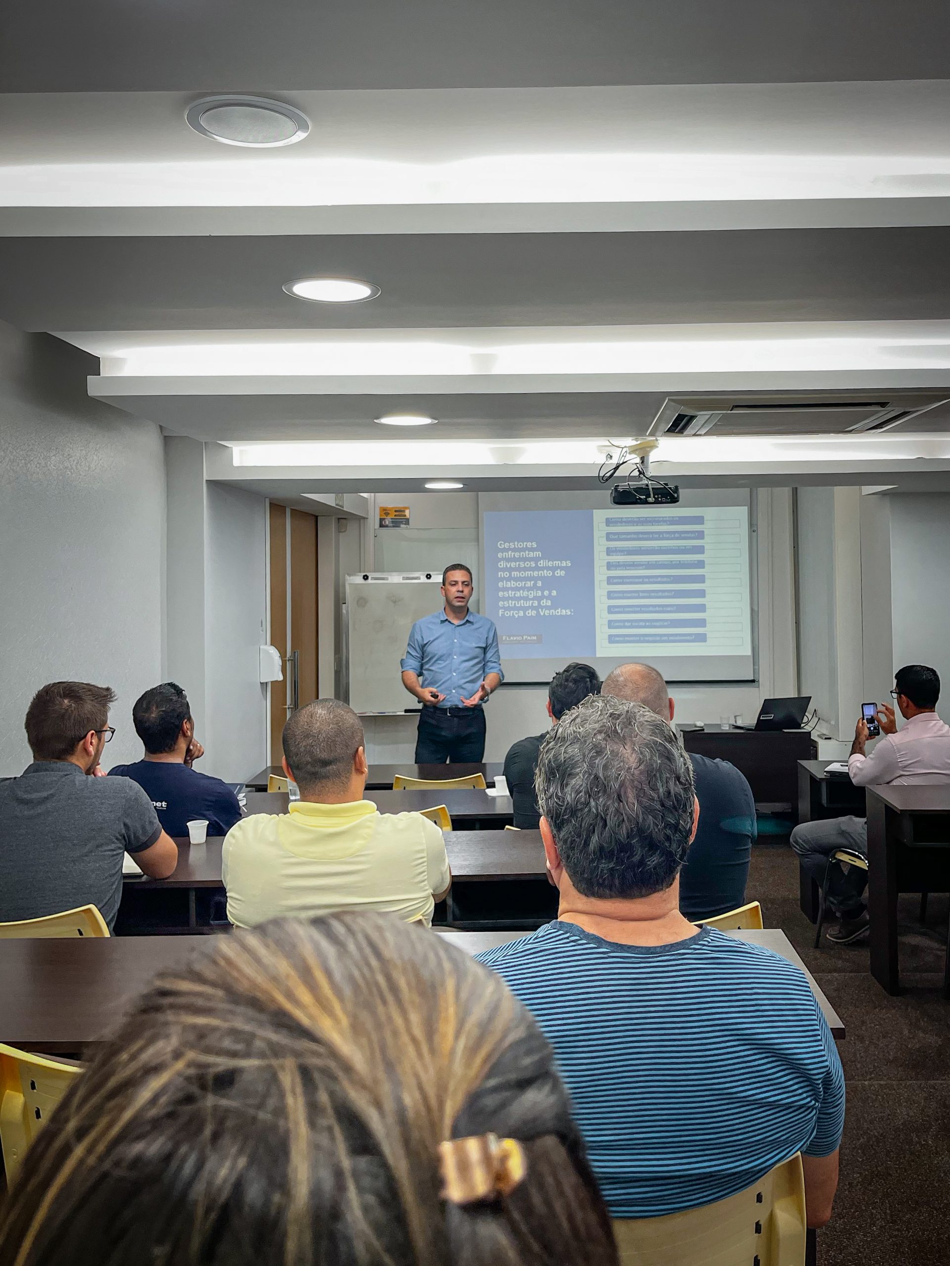 No primeiro encontro, o consultor Flávio Paim destacou que o gestor de vendas deve ser a referência da equipe, fornecendo direção, alinhamento e controle — como uma bússola que orienta o caminho e um mapa que indica a melhor estratégia. Durante a aula, foram abordados temas essenciais como construção de metas, motivação da equipe, indicadores de desempenho e planejamento estratégico de vendas.