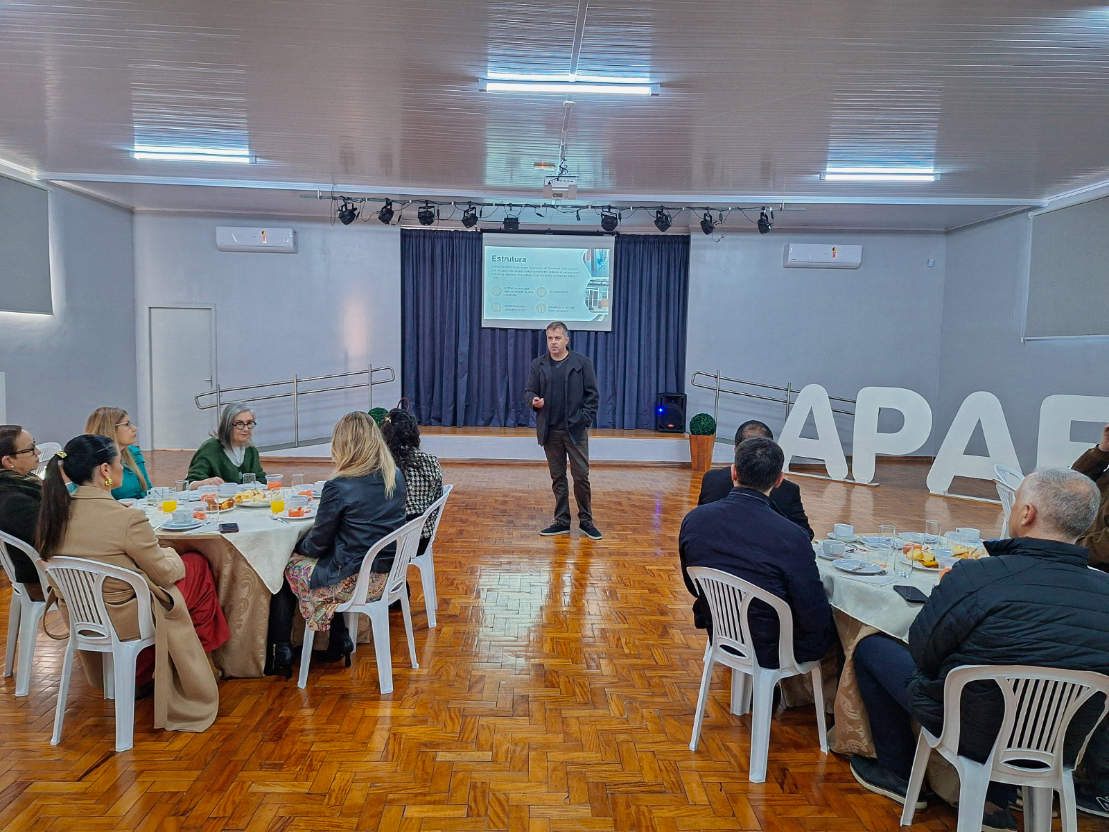 Durante o encontro, o presidente da APAE, Marlon Batista Moraes, apresentou o novo vídeo institucional e compartilhou dados que evidenciam a relevância do trabalho da entidade. A APAE conta com uma estrutura de 10 mil metros quadrados, 80 funcionários e atende mensalmente cerca de 600 pessoas de todas as idades, servindo mais de 26 mil refeições por ano. Na área da saúde, são 31 mil atendimentos anuais realizados em convênio com o SUS, abrangendo 28 municípios da região, além da participação no programa estadual TEAcolhe RS, que garante mais de 150 atendimentos mensais voltados ao espectro autista.